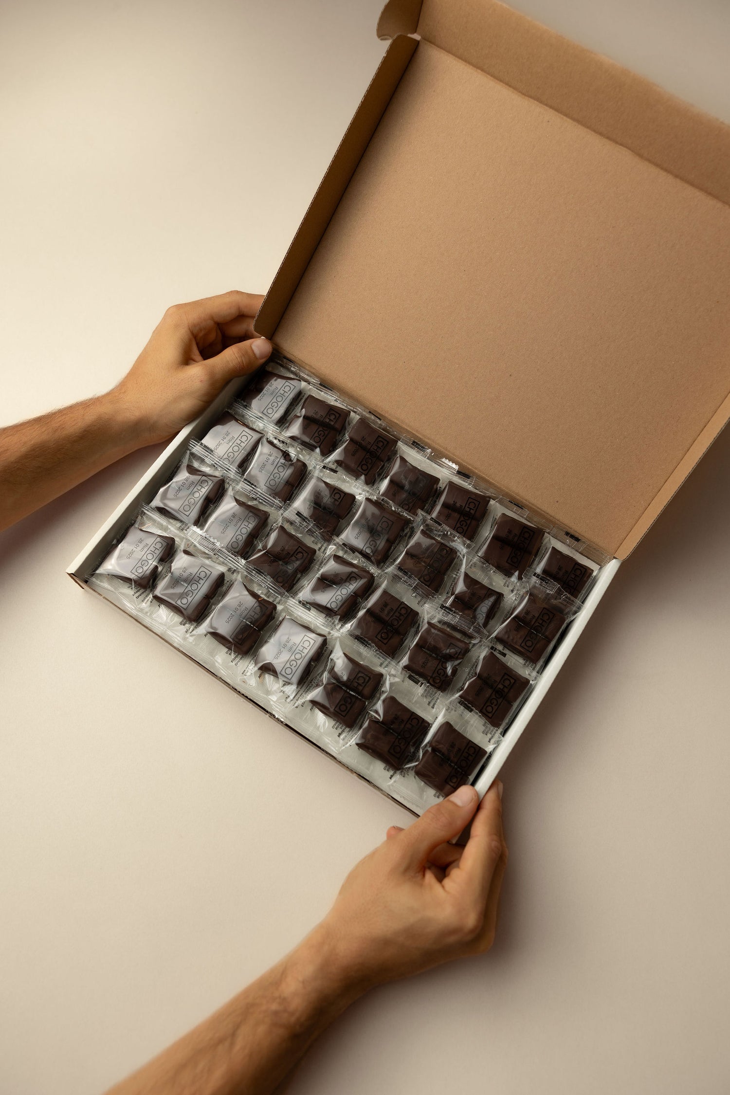 Pakkerne er som udgangspunkt flowpakket med to stk. i hver pakke. Dette så du nemt kan servere en pakke med to små chokoladebarer til borgerne.